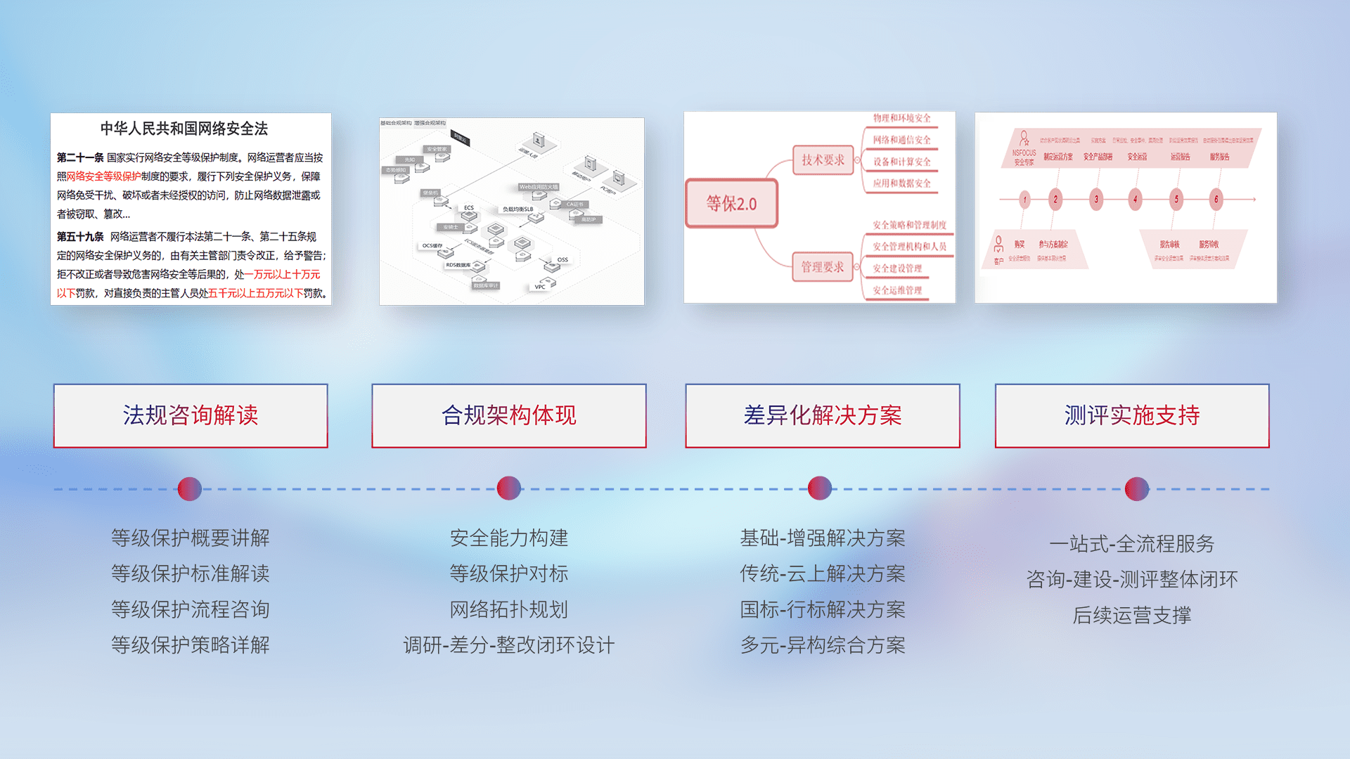 通过专业的法律咨询解读、、、、合规架构体现、、、差异化解决方案、、、、测试实施支持等服务,,,,为客户量身打造等保合规体系。。。